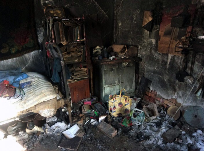 Этот дом построили его родители еще в 50-60-х годах. На запачканных сажей стенах все еще висят остатки их вещей: часы, подсвечники, картины. Пожар чудом почти не тронул книги, зато их залило водой. Жить здесь сейчас невозможно: кругом сырость, копоть, нет электричества. Добрые люди заменили старику окна и обещали помочь с углем. Но Владимир Васильевич опасается, что и без того ветхий дом вот-вот рухнет от влаги и мороза.