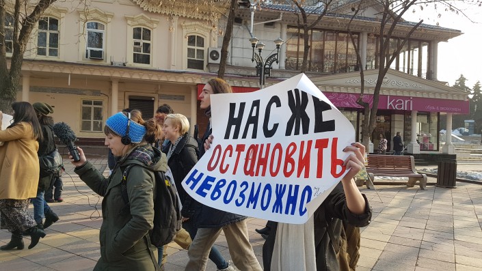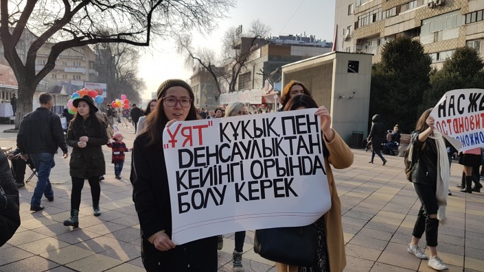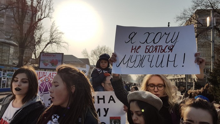 Марш продлился менее десяти минут. Активисты движения KazFem выкрикивали лозунги и в руках держали различные плакаты.