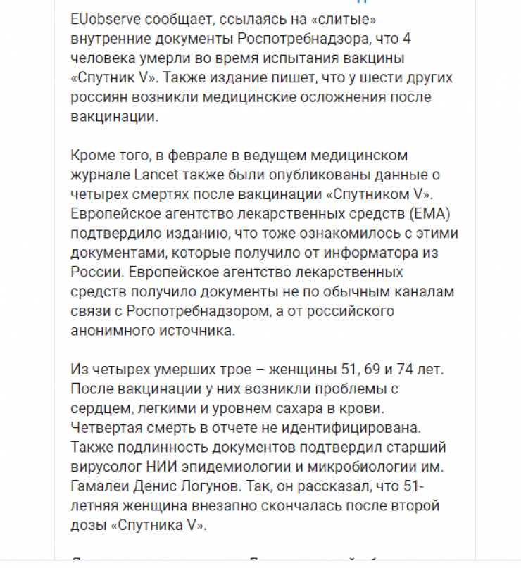 Казахстанцы обеспокоены сообщениями о смертях, якобы произошедших во время клинических испытаний вакцины "Спутник V". В Telegram-чатах пользователи сообщают о четырех скончавшихся добровольцах, причем об этом якобы стало известно лишь после утечки секретных данных, передает Tengrinews.kz со ссылкой на Stopfake.kz.