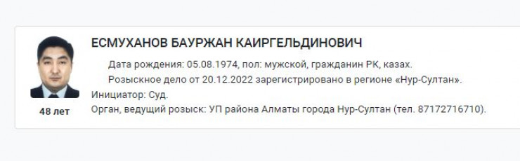 Постановлением суда № 2 Алматинского района Астаны 19 декабря 2022 года Бауржан Есмуханов объявлен в розыск. Объявление о розыске также размещено на сайте портала органов правовой статистики и специальных учетов.