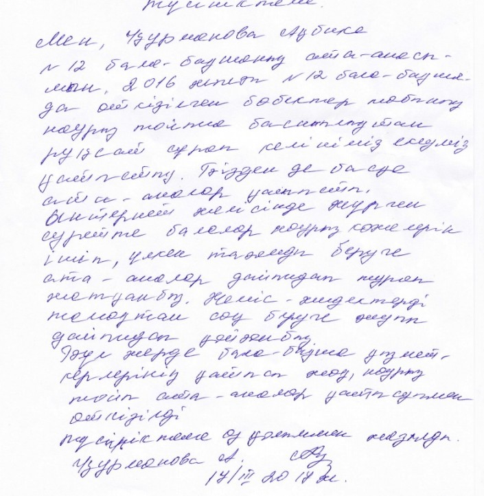 "Я, Куманова Акбиге, родительница детского сада № 12. В 2016 году мы попросили разрешения у руководства провести мероприятие на Наурыз и сходили туда вместе со снохой. Там были и другие родители. На фото, которое распространилось в Интернете, дети уже покушали наурыз коже, а мы, родители, готовили им горячее блюдо. Фрукты мы помыли и подготовили. Сотрудники детского сада к этому никакого отношения не имеют. Праздник Наурыз был проведен с участием родителей. Объяснительная была написана собственноручно", - говорится в объяснительной.