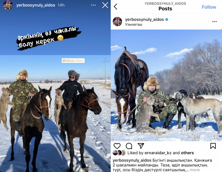 Отметим, что на охоте присутствовал непобежденный казахстанский боксер Айдос Ербосынулы. Он также продемонстрировал окровавленное животное на своей странице в Instagram. Спортсмен сообщил, что в тот день охота закончилась добычей в виде двух шакалов.