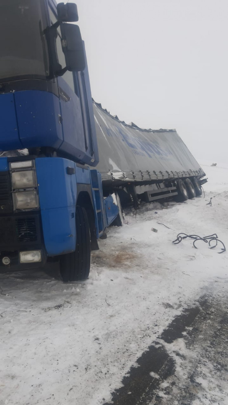 "Мы ехали со стороны Костаная в сторону Актобе с грузом около 70 тонн. До границы оставалось примерно 30 километров. На трассе был очень сильный гололед. Ветер был настолько сильный, что машину сдуло и прицеп опрокинуло. Здесь не одна машина лежит на боку, дальше еще авто из Узбекистана. Обращались уже везде - в полицию, МЧС, "КазАвтоЖол", помощи до сих пор нет. Обращались к частникам, но те просят 100 тысяч тенге, при этом не обещают помочь, поскольку гололед все еще сохраняется и выезжать никто не рискует", - рассказал костанайский дальнобойщик Петр Калугин.