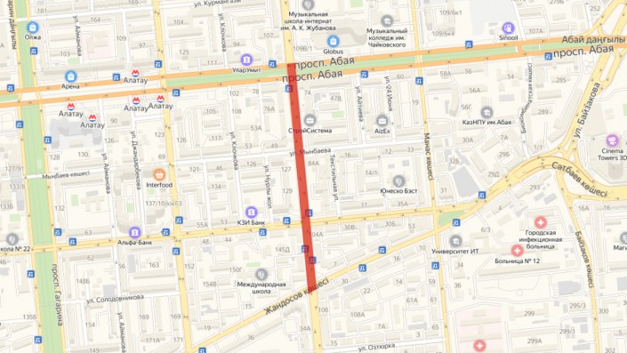 По улице Казыбек би от улицы Кунаева до улицы Зенкова.
