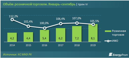 За январь-сентябрь этого года объем розничной торговли составил 8,1 триллиона тенге - на 5,5 процента больше, чем в соответствующем периоде 2018 года (7,2 триллиона тенге). А в сельской местности наторговали на 676,2 миллиарда тенге.
