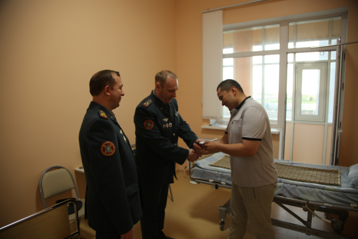 "Так как вы завтра уезжаете в свою воинскую часть, мы рады вам вручить офицерские погоны, чтобы прибыли на свое место службы уже офицером", - сказал заместитель начальника Главного управления воспитательной и социальной и социально-правовой работы Александр Крамар, вручая Сундетову погоны в военном госпитале.