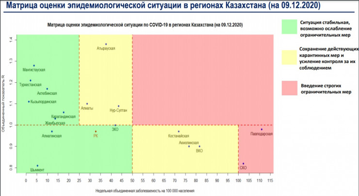 "Как вы знаете, у нас два региона находятся в "красной" зоне - Северо-Казахстанская и Павлодарская области. В "желтую" зону переместились Костанайская и Акмолинская области, также в ней находятся Алматы, Нур-Султан, Восточно-Казахстанская и Атырауская области. Остальные регионы находятся в "зеленой" зоне. Конечно, мы бы хотели, чтобы у нас не было регионов в "красной" зоне с высоким ростом заболеваемости и распространения", - сказал Киясов на онлайн-брифинге СЦК.