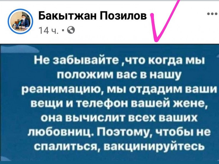 На своей странице в соцсети медик написал: "Не забывайте, что когда мы положим вас в нашу реанимацию, мы отдадим ваши вещи и телефон вашей жене, она вычислит всех ваших любовниц. Поэтому чтобы не спалиться, вакцинируйтесь".
