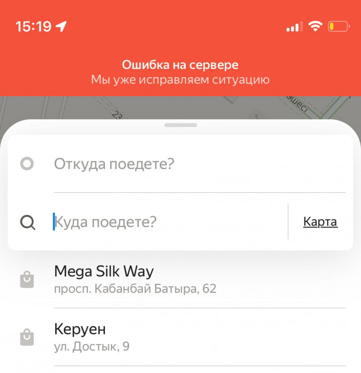 При попытке заказать такси в приложении появляется надпись "Ошибка на сервере".