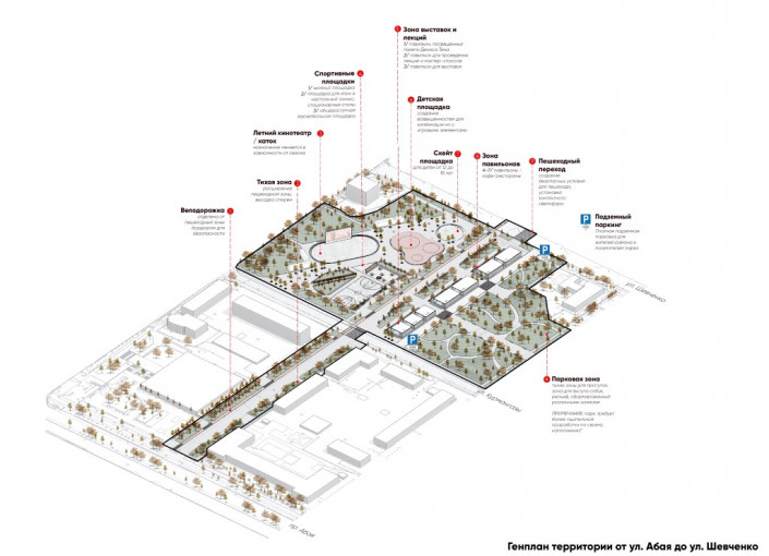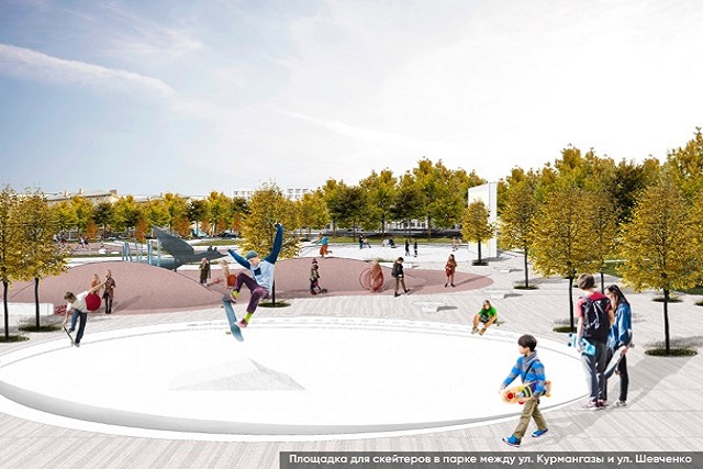 На суд общественности представлено всего два проекта. Первый предполагает благоустройство на участке от улицы Абая до улицы Шевченко. В частности, авторы предусмотрели велодорожку, парковую зону, летний кинотеатр, спортивные, детские и скейт-площадки, зону для выставок и лекций.