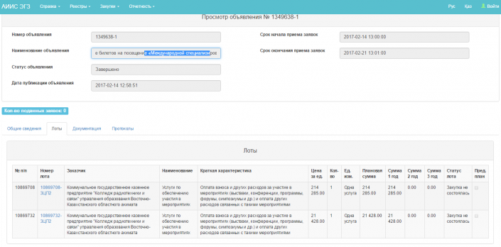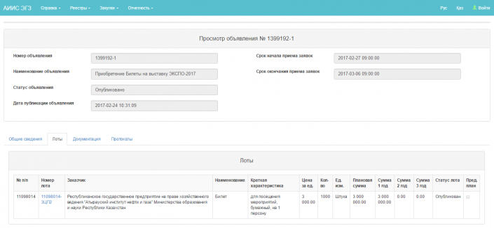 Семейский колледж радиотехники и связи опубликовал лот под названием "Приобретение билетов на посещение "Международной специализированной выставки ЭКСПО-2017" для студентов - 80 человек и взрослых - 4 человека" на общую сумму 235 713 тенге.