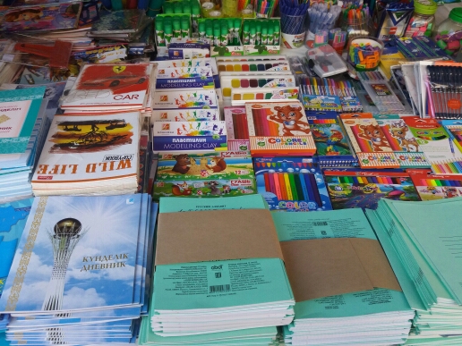 Тонкие тетради на алматинских базарах и школьных ярмарках можно приобрести от 15 тенге за штуку, а общие тетради -по 80 тенге и дороже. Альбом для рисования стоят от 150 тенге в зависимости от количества страниц. Тканевые пеналы - от 400 тенге, пластилин - от 250 тенге. Набор обложек для книг (20 штук) от 250 тенге и выше. Самые дешевые рюкзаки на рынке стоят 2500 тенге. Дневники стоят от 200 тенге.