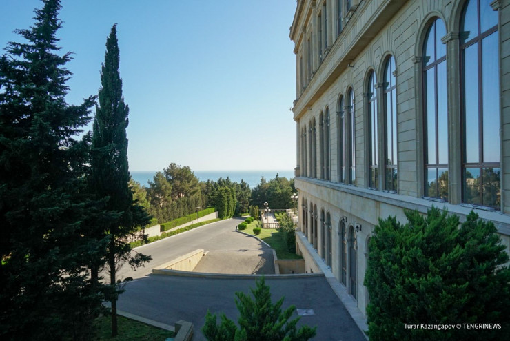 Здание загородной резиденции относительно небольшое, а из окон открываются виды на Каспийское море.