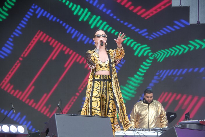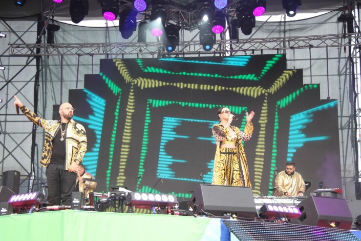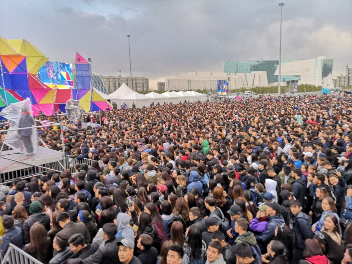 Несмотря на ветер и прохладную погоду, уже ставшую привычной для Астаны, на площади "горячо". Хит за хитом звучат со сцены в казахстанской столице. Многотысячную аудиторию под "Туманы" "раскачали" Макс Барских, украинская и российская поп-группа Artik & Asti - под песни "Номер 1" и "Неделимы". Горячо аудитория встретила рэпера Натана, Рината Малцагова, Анну Седокову, Джигана и группу "Градусы".