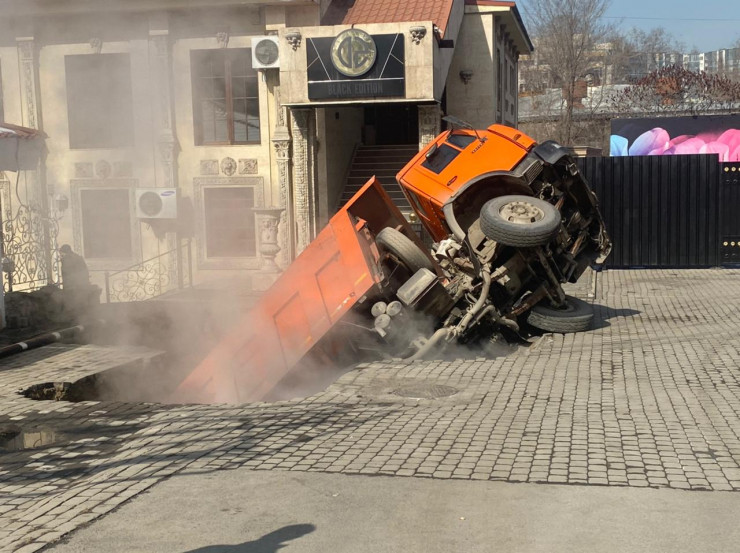 Грузовик провалился под землю в Алматы. Видео с места происшествия разослали очевидцы, а медики сообщили, что сотрудник частного предприятия получил травмы, передает корреспондент Tengrinews.kz.