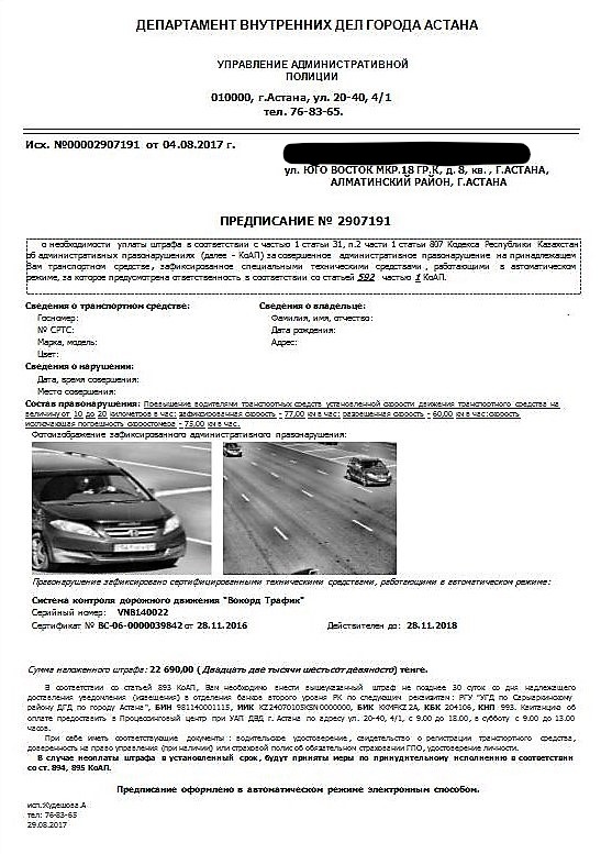 "В случае попадания правонарушения в область наблюдения видеокамер протокол об административном правонарушении не составляется и постановление не выносится. Вместо этих документов при совершении водителем нарушения ПДД уполномоченным органом будет оформлено предписание на основе составляющих правонарушения. На первом этапе радарный комплекс автоматически определяет превышение скоростного режима или пересечение автобусных и стоп-линий с фото- и видеофиксацией нарушения. Затем фотография и видеозапись нарушения поступают в процессинговый центр для проверки инспектором-оператором УАП города, во время которой определяются данные свидетельства о регистрации технического средства (СРТС) по номеру автотранспорта, а также персональная информация о владельце авто. Обращаем особое внимание на важный момент: предписание оформляется согласно данным СРТС (техпаспорта) на владельца автотранспорта, а не на водителя, который в момент совершения нарушения может управлять транспортным средством", - отметили в акимате столицы.