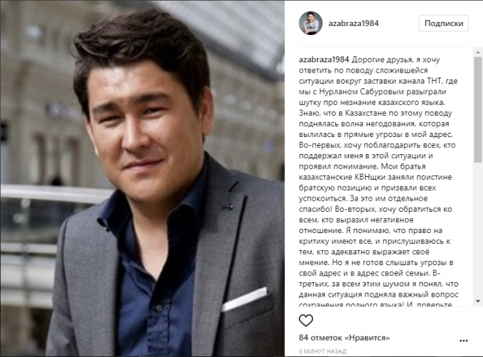 "Дорогие друзья, я хочу ответить по поводу сложившейся ситуации вокруг заставки канала ТНТ, где мы с Нурланом Сабуровым разыграли шутку про незнание казахского языка. Знаю, что в Казахстане по этому поводу поднялась волна негодования, которая вылилась в прямые угрозы в мой адрес. Во-первых, хочу поблагодарить всех, кто поддержал меня в этой ситуации и проявил понимание. Мои братья казахстанские КВНщики заняли поистине братскую позицию и призвали всех успокоиться. За это им отдельное спасибо!