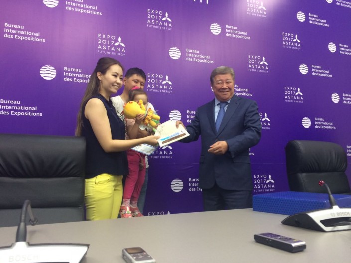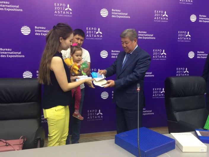 Глава нацкомпании вручил миллионному посетителю несколько многоразовых абонементов на EXPO-2017, которые позволят ей посещать выставку неограниченное количество раз, планшет, портативное зарядное устройство и сувениры на память. Трехлетняя дочь Гульжихан получила в подарок игрушечного маскота EXPO-2017.