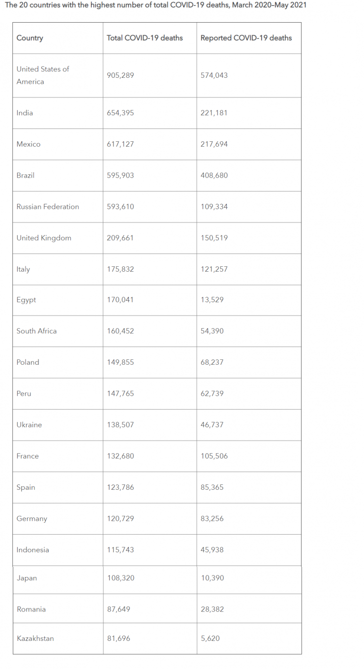 В список стран с наибольшим числом умерших от коронавируса также вошли США, Индия, Мексика, Бразилия, Россия, Великобритания, Италия, Иран, Египет, Южная Африка, Польша, Перу, Украина, Франция, Испания, Германия, Индонезия, Япония и Румыния.