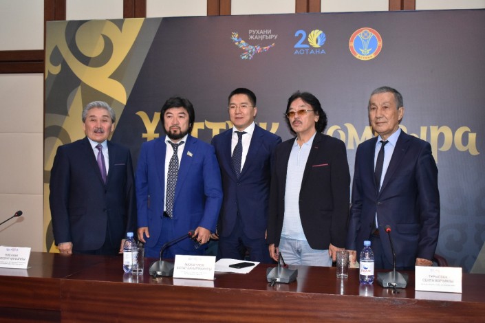 Участники пресс-конференции по случаю празднования Дня домбры: руководитель Управления культуры и спорта Астаны Болат Мажагулов, заслуженный артист РК Бекболат Тлеухан, заслуженный артист Казахстана, куйши Секен Турысбек.  Профессор, куйши Айтжан Токтаган, а также художественный руководитель и главный дирижер Казахского оркестра государственной академической филармонии акимата Астаны, композитор Айткали Жайымов.