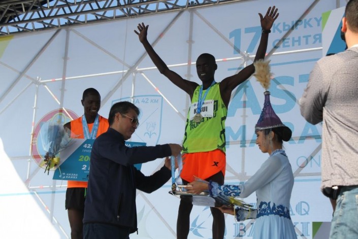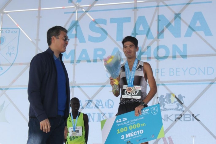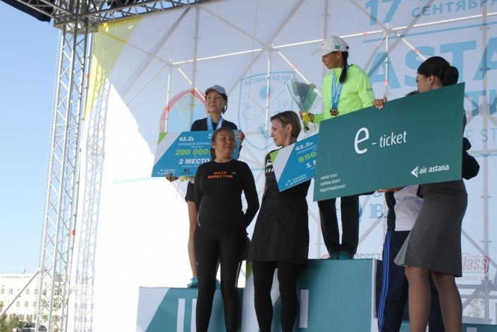 В этом году победителям в дистанции 42,2 километра (для мужчин и женщин) вручаются следующие призы: за первое место - 850 000 тенге плюс авиабилет в любом направлении; за второе место - 200 000; за третье - 100 000 тенге.