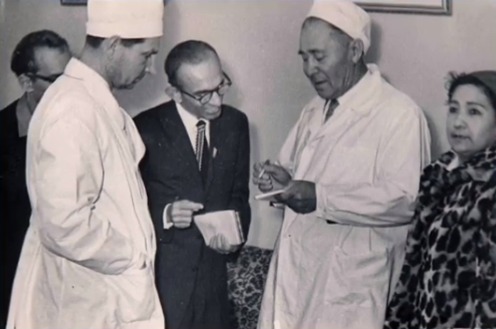 "В 1958 году это было. Пациенту - 29 лет, младший научный сотрудник Назаренко Аркадий Васильевич. Несколько раз отек легкого был, он умирал. Потом коллега, Юрий Михайлович Брякин, говорит: "Александр Николаевич, больной погибает от сужения двустворчатого клапана, отека легкого. Срочно надо делать операцию. Вы просто палец суньте в левое предсердие, расширьте, у вас палец огромный, а там всего два-три миллиметра отверстие". Брякин, я, потом к нам присоединился Семушкин, так, в общем, Сызганова и уговорили", - вспоминает хирург Андижан Измуханов.
