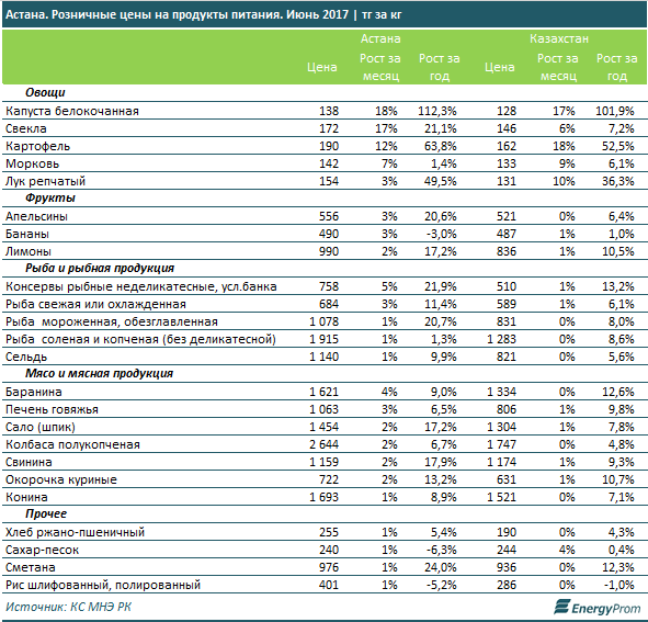 В то же время столичный акимат сообщил, что рост цен на продукты питания в Астане связан не с ЭКСПО, а с сезонным уменьшением запасов. Управление сельского хозяйства сообщило, что в мае был зафиксирован значительный рост цен на лук (41,9 процента), картофель (22,2 процента), капусту (19,8 процента) и морковь (18,2 процента).