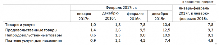 Цены на продовольственные товары за два месяца 2017 года (февраль 2017 года к декабрю 2016 года) увеличились на 2,6 процента, на непродовольственные товары - на 1,3 процента, на платные услуги - на 1,2 процента.