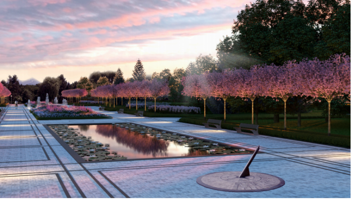 Северный партер с Тимирязева будет классическим: пешеходный (сухой) фонтан, старая ива станет символом Ботанического сада. Посетителей ждут пруд с коллекцией водных растений и водоем с островом в восточном стиле. Вдоль главной аллеи будут высажены сакуры и другие деревья, не требующие тщательного ухода.