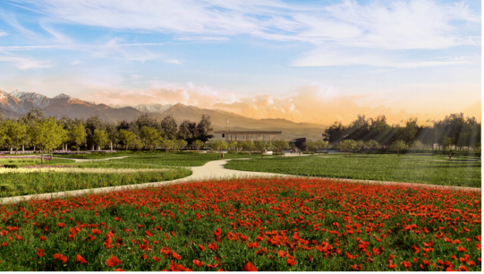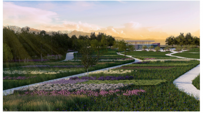 "В южном партере со стороны Аль-Фараби сейчас голое поле. Поэтому нужно все начинать с нуля. Планируется поставить дорожки, насаждения, пруды. Воды не хватает, поэтому ее будут брать из реки, которая проходит восточнее Есентая. Не засаживая всю территорию деревьями, мы открываем вид на горы. По центру партера располагаются луга. На них высаживаем многолетние растения: тюльпаны, маки, ирисы и другие. По краям луга будут располагаться деревья высокого яруса: березы, липы, дуб, рябины", - отметил Ерлан Оспанов.
