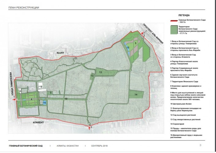 "Планируем обновить партер со стороны Тимирязева, организовать посадки, обновить покрытия дорожек. Места, где возможны археологические раскопки, не тронем. Также планируем дополнить декларативными и многолетними растениями, деревьями, клумбами", - перечислил представитель автора проекта Ерлан Оспанов.