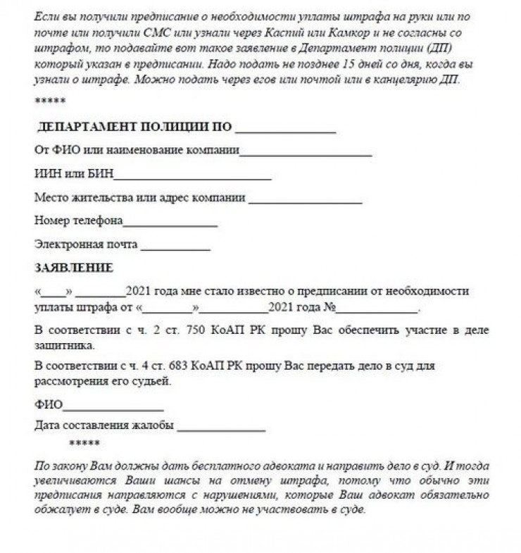 И вот я придумал способ, как с этим бороться. Если вы получили ПС на руки или по почте, получили СМС или узнали через "Каспий" или "Камкор" и не согласны со штрафом, то подавайте вот такое заявление в Департамент полиции, который указан в предписании. Надо срочно подать его, не позднее 15 дней со дня, когда вы узнали о штрафе. Можно подать через егов. Или почтой. Или в канцелярию ДП", - написал Сулейманов.