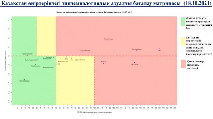 Матрица оценки эпидемиологической ситуации изменилась в регионах Казахстана 17 октября 2021 года, передает Tengrinews.kz со ссылкой на МВК по нераспространению COVID-19.