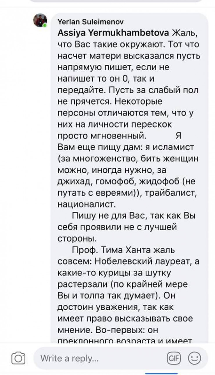 Ерлан Сулейменов прокомментировал публикацию пользовательницы Facebook Асии Ермухамбетовой о прошедшем заседании Нацсовета общественного доверия.