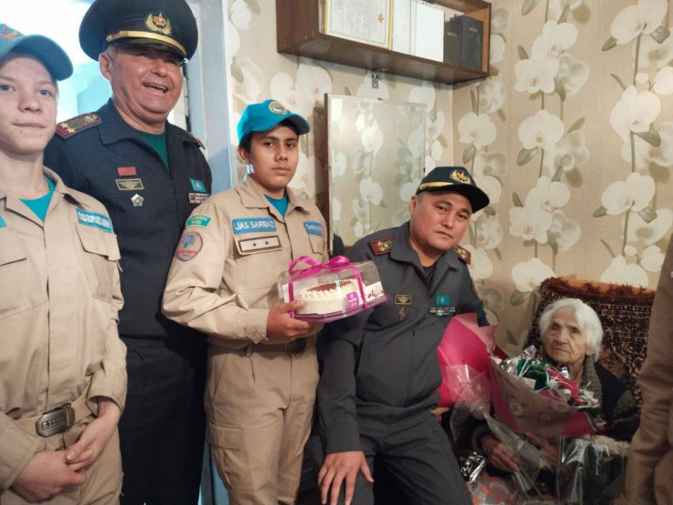 Долгожительницу со 100-летним юбилеем поздравили военнослужащие Управления по делам обороны Турксибского района Алматы, войсковой части 68602 Десантно-штурмовых войск, воспитанники военно-патриотического движения "Жас сарбаз", ветераны Афганской войны.