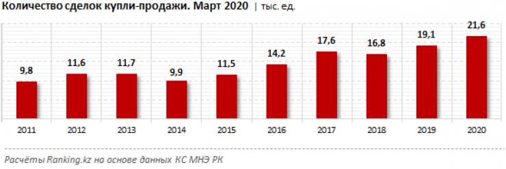 Несмотря на мировой кризис, пандемию коронавируса и очередную девальвацию тенге, рынок недвижимости в Казахстане остается активным. Так, даже в "карантинном" марте казахстанцы совершили 21,6 тысячи сделок купли-продажи жилой недвижимости - на внушительные 12,8 процента больше, чем в марте прошлого года, передает Tengrinews.kz со ссылкой на Ranking.kz.