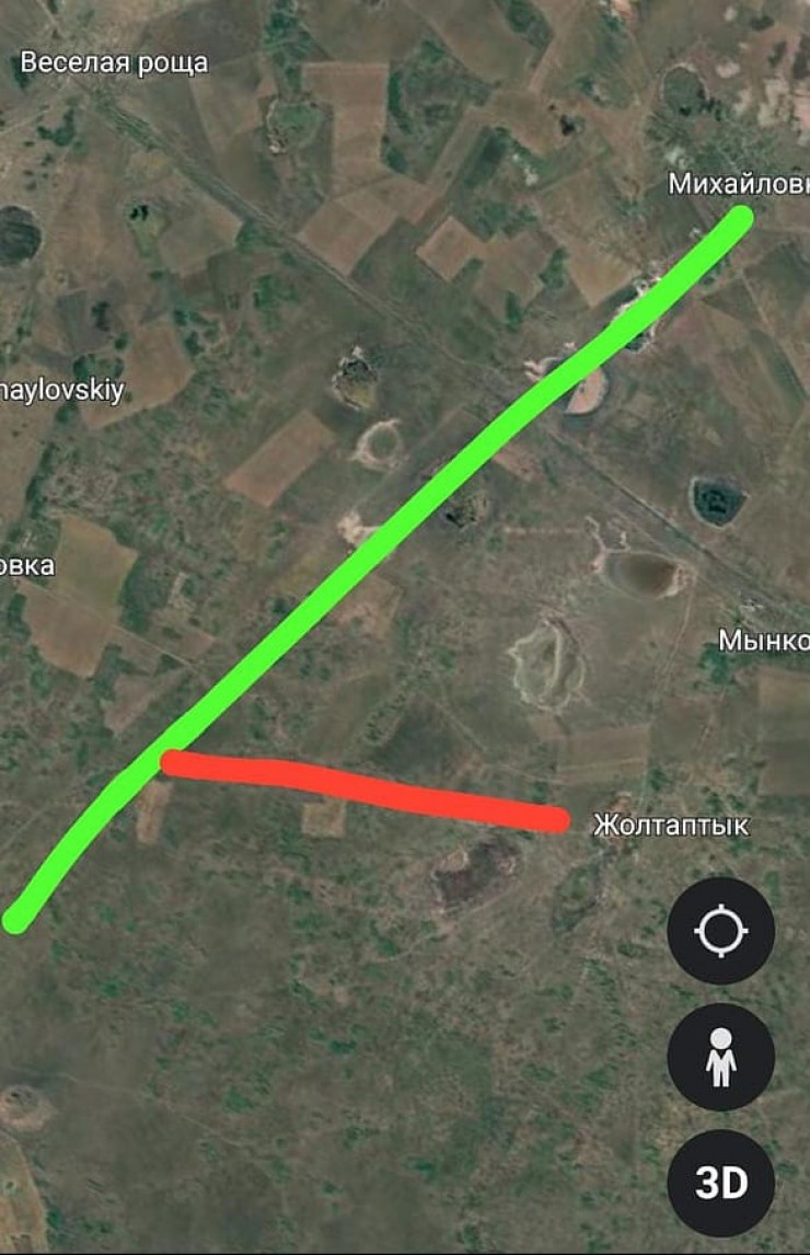 "Зеленая линия - это трасса до аула Михайловка, а красная линия - это трасса до аула Жолтаптык, 15 километров трассы без твердого покрытия. Ее при СССР не успели залатать, вот так и осталось по сей день", - говорят жители села Жолтаптык.