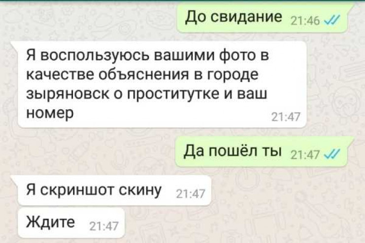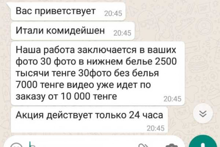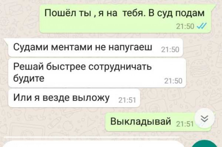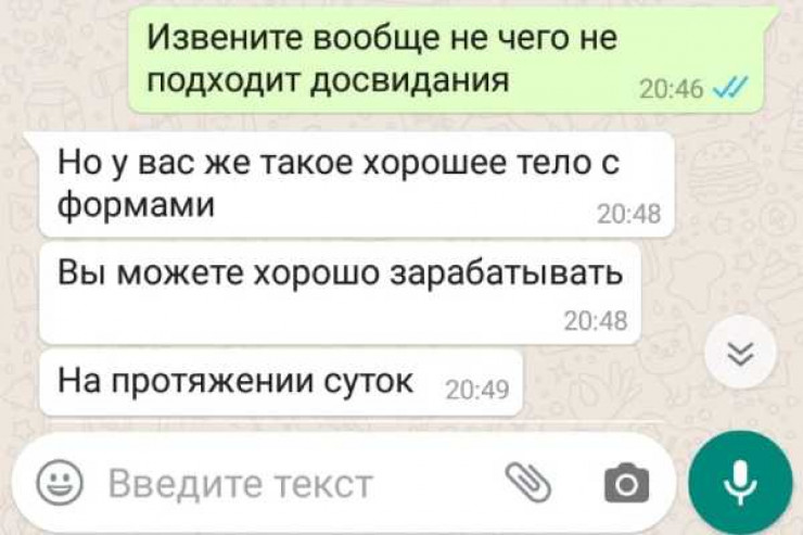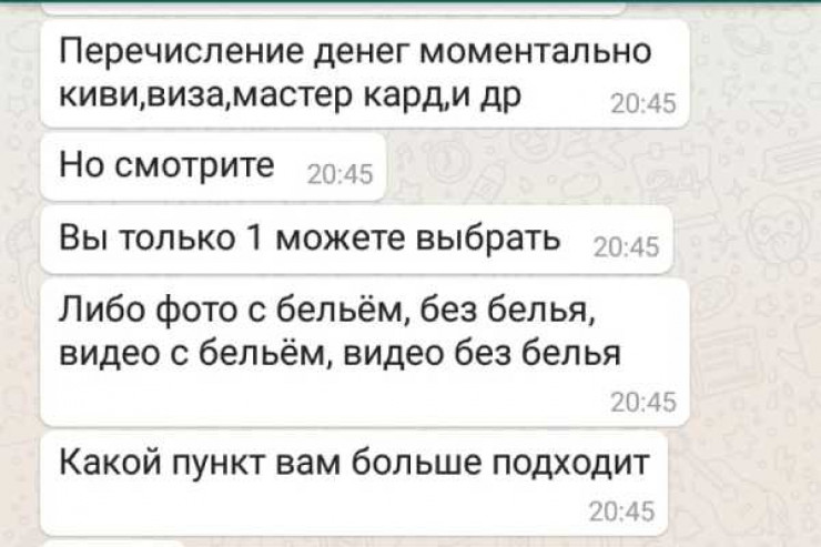 "Я написала, потому что искала подработку, скинула свой номер телефона и тут же получила инструкцию: нужно отправить фотографии в белье или без одежды, - рассказывает Екатерина. - Я сразу же отказалась, но следом мне посыпались угрозы".