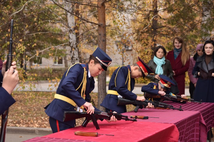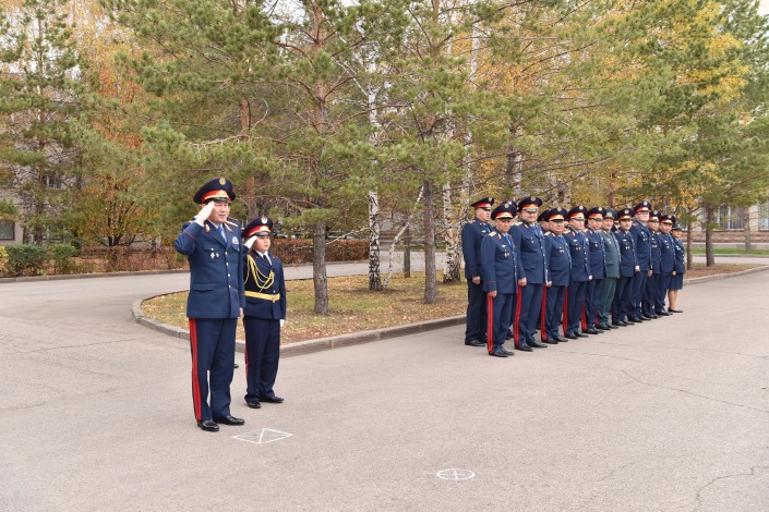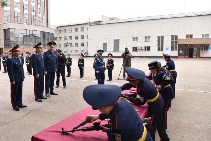 Школьники показали руководству министерства свои навыки по строевой подготовке и умения по разборке и сборке автомата, а также выступили с концертной программой, исполнив для полицейских песни "Мәңгілік ел", "Нұр аға" и другие концертные номера.