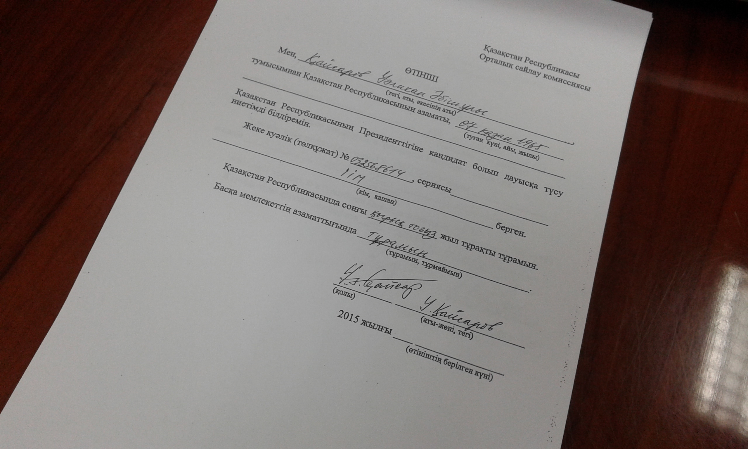 "Я никак не мог написать, что я гражданин другого государства, потому что я гражданин Казахстана по рождению (...). В заявлении написано: сколько лет Вы являетесь гражданином Казахстана? Я указал, что я 49 лет являюсь гражданином Казахстана. Попросили указать домашний адрес, я указал домашний адрес вплоть до квартиры. (...) Если бы я написал в двух местах, что я не гражданин Казахстана, в чем я сомневаюсь (...). Поэтому я попросил показать мое заявление, хочу собственными глазами увидеть", - сказал Кайсаров журналистам. По крайней мере, такое его заявление выглядит странным, поскольку он собственноручно написал заявление.