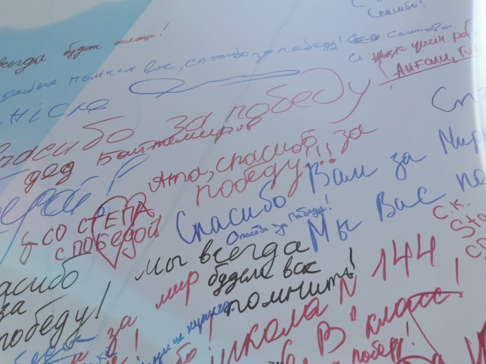 У мемориала установили стенд, на котором горожане пишут слова благодарности за Победу.