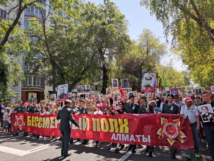 12.00 В Алматы шествие началось на площади Астана (Старая площадь). Все желающие собрались в условленном месте за час до назначенного времени. Перед началом марша прошел концерт. В нем приняли участие местные творческие коллективы, которые исполнили военные песни. Колонна направляется в сторону парка имени 28 панфиловцев. "Бессмертный полк" пройдет по улице Толе би до улицы Достык, оттуда вниз до Айтеке би, далее до Зенкова и закончит свое шествие у Вечного огня.