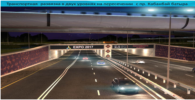 На пересечении с проспектом Кабанбай батыра построят развязку туннельного типа, Обход пройдет по нижней части, а проспект Кабанбай батыра - по верху.