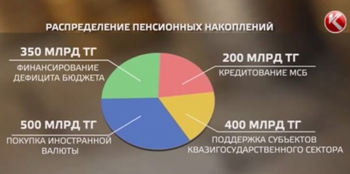 Еще в начале этого года власти Казахстана решили, куда вложить 1,5 триллиона тенге пенсионных накоплений. 200 миллиардов направили в виде кредитов предпринимателям, 400 миллиардов на поддержку нацкомпаний, на 500 миллиардов закупили иностранную валюту, еще 350 миллиардов ушли на финансирование дефицита бюджета.