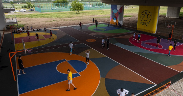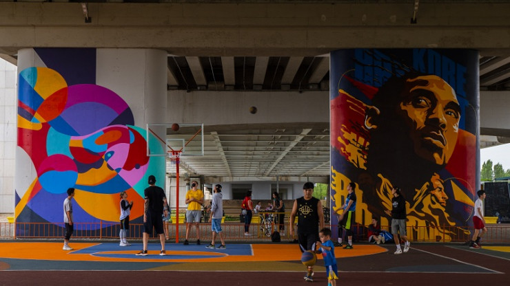 Проведено оформление колонн моста граффити-рисунками. На одной из стен изображен портрет легендарного баскетболиста Коби Брайанта. Жители могут здесь не только заниматься спортом, но и устраивать фотосессии.