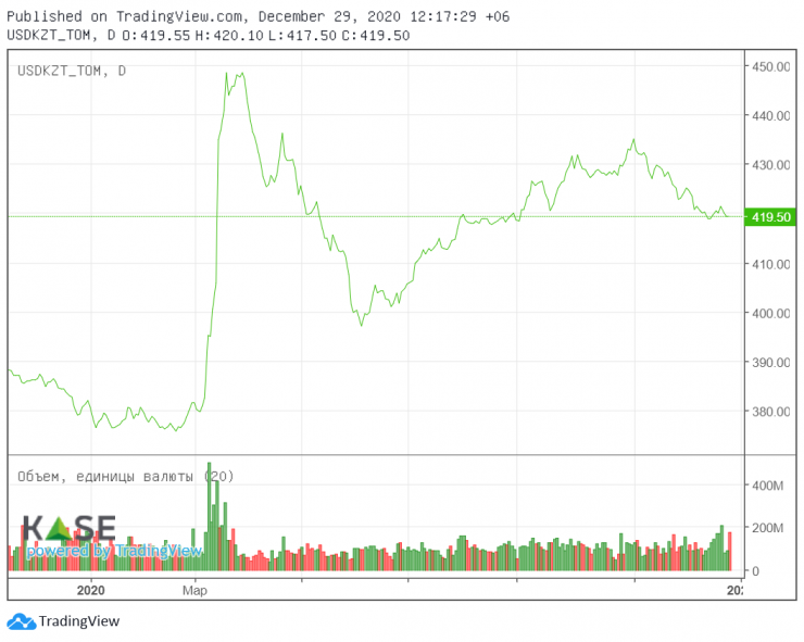 По данным Национального банка, 31 декабря 2019 года стоимость доллара в Казахстане составляла 381,18 тенге. Официальный курс доллара на 1 января был 382,59 тенге. Официальный курс на 29 декабря 2020 года - 419,87 тенге. Можно сказать, что за год американская валюта подорожала в Казахстане на 37,28 тенге.