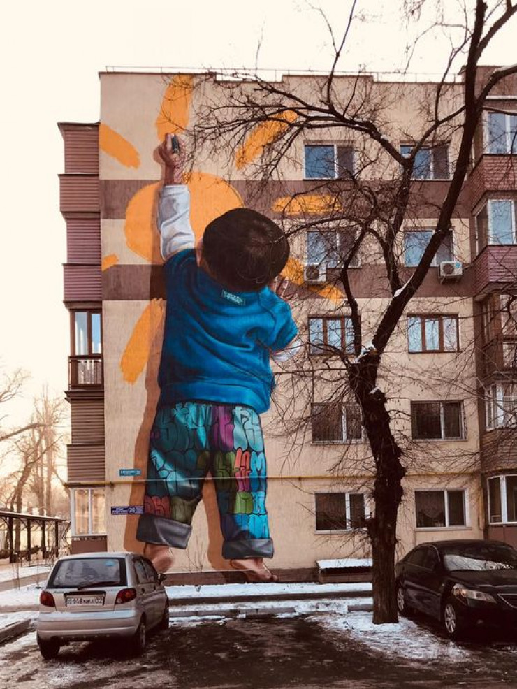 Объемный мурал с изображением мальчика, рисующего солнце, восхитил алматинцев. Стрит-арт появился недавно на пересечении улиц Сауранбаева и Молдагалиева в Алматы. Один из создателей мурала - Ержан Танаев - рассказал подробности появления рисунка, передает корреспондент Tengrinews.kz.