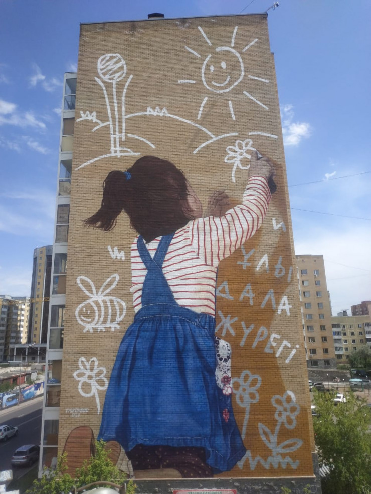 "В районе Алматы-1 открылась пешеходная улица, наподобие Арбата. К открытию мы с Али Закиром подготовили два стрит-арта. Первый - это книги, а второй - ребенок. Я думаю, суть обоих рисунков достаточно понятна и не требует разъяснения. Маленький мальчик рисует солнышко - достаточно позитивная картина. Присутствуют цвета флага - голубой и желтый", - рассказывает Ержан Танаев.