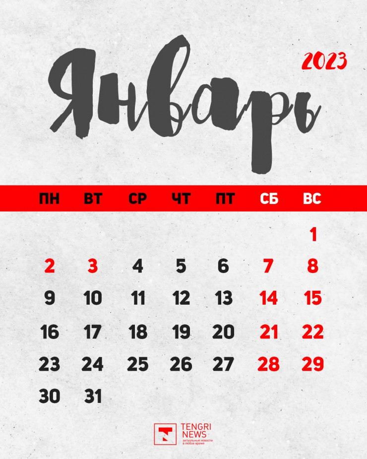 Предстоящий 2023 год для казахстанцев начнется с воскресенья, и выходные продлятся до 3 января. Последующие три дня - 4, 5 и 6 января - будут рабочими. Календарь с предстоящими праздничными датами можно скачать в материале корреспондента Tengrinews.kz.