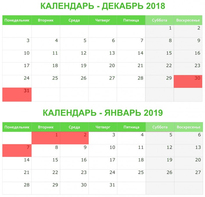 Праздничные и выходные дни в канун празднования Нового года выпадают на 30 декабря, воскресенье, и 31 декабря, понедельник, а также на 1 и 2 января - вторник и среду соответственно.